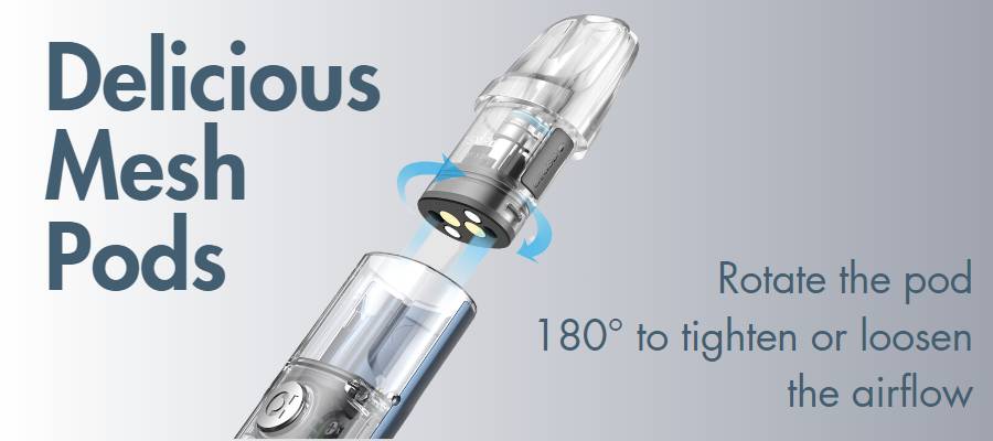 The Cyber S is compatible with the Aspire TSX Replacement Pods, which are sold separately in packs of 2 in either a 0.8Ω (ohm) mesh or a 1.0Ω (ohm) mesh resistance. You’ll receive one of each pod with your purchase of the kit. You can easily adjust the airflow on the pod by rotating it 180° inside the battery.
