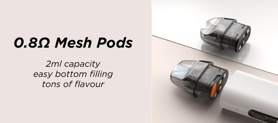 The kit includes a refillable Aspire Minican pod with a 2ml E-Liquid capacity. The pod utilises a bottom-fill system for easy refills. The built-in 0.8Ω (ohm) mesh coil offers denser flavour and vapour per puff compared to standard wire coils, ideal for MTL vaping.