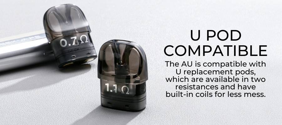 The AU utilises the 2ml capacity refillable GeekVape U Replacement Pods, which have built-in coils and are available in two resistances: 0.7Ω (ohm) and 1.1Ω (ohm). You’ll receive one of each pod with your purchase of the kit.