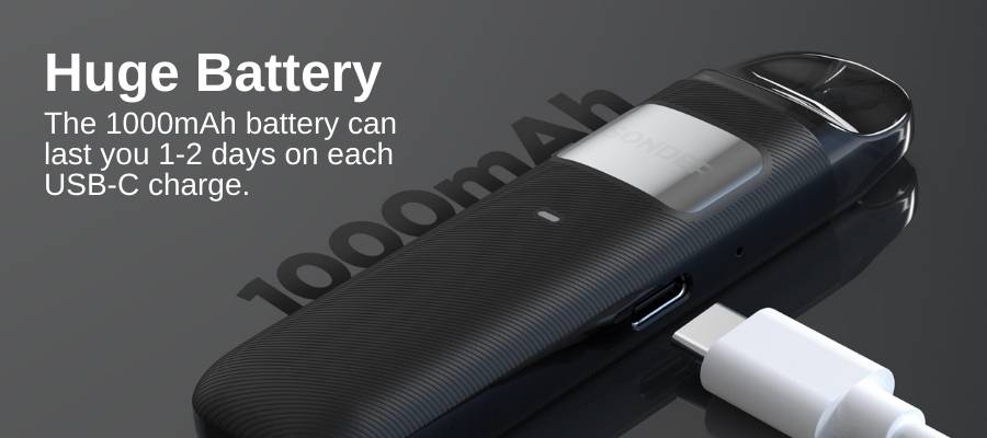 The large 1000mAh internal battery should last most vapers a full day before requiring a recharge via the USB Type-C port located on the side of the device (cable not included).