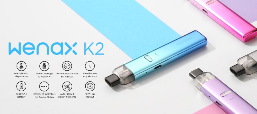 <p>The <strong>GeekVape Wenax K2 Vape Kit</strong> is a sleek pod vape crafted to satisfy MTL vapers. Powered by a 1000mAh battery, the device is equipped with three power levels and offers adjustable airflow. The option to choose between button or inhale activation makes this vape incredibly user-friendly, and the device uses 2ml pods with built-in coils for easier maintenance.</p>