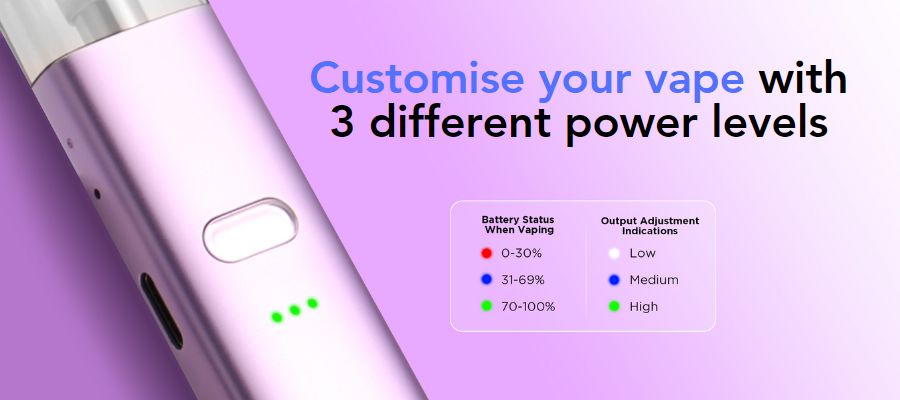 The interface showcases button and inhale activation, an adjustable airflow toggle, and three power modes (low, medium, high), which can be set via the power button to suit your preference.