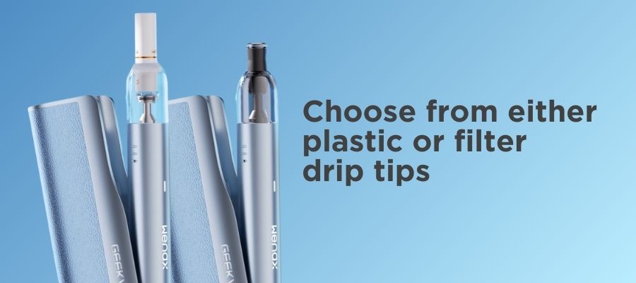 The device comes included with 10 filter tips, ideal for those transitioning away from smoking cigarettes and heated or smokeless tobacco products. Each pod also comes fitted with a reusable plastic drip tip.
