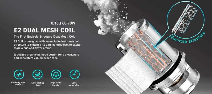 The 0.16Ω (ohm) coil has a dual mesh structure for incredibly dense clouds. These coils are best fired between 60-70W and should be paired with high-VG E-Liquids, like shortfills.