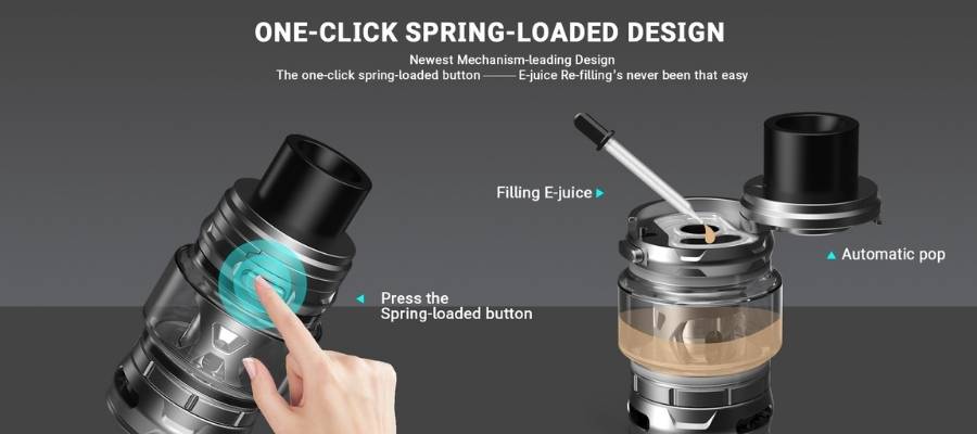 The tank offers a host of handy features from top to bottom. The spring-loaded top-fill port allows you to open the port with a single press of a button, which then pops open the fill port for a mess-free refill experience. Plus, the fill port clicks shut when you’re finished filling, so you won’t have to worry about leakage. The airflow control ring along the bottom of the tank allows you to freely adjust your airflow settings to better suit your vaping style, with a rising vertical-ventilation airflow design to help provide a smoother vapour.