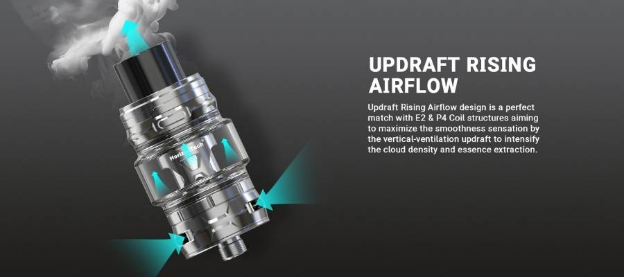 The vertical airflow design allows for a smoother E-Liquid distribution of the coil, resulting in a denser cloud production and better flavour.
