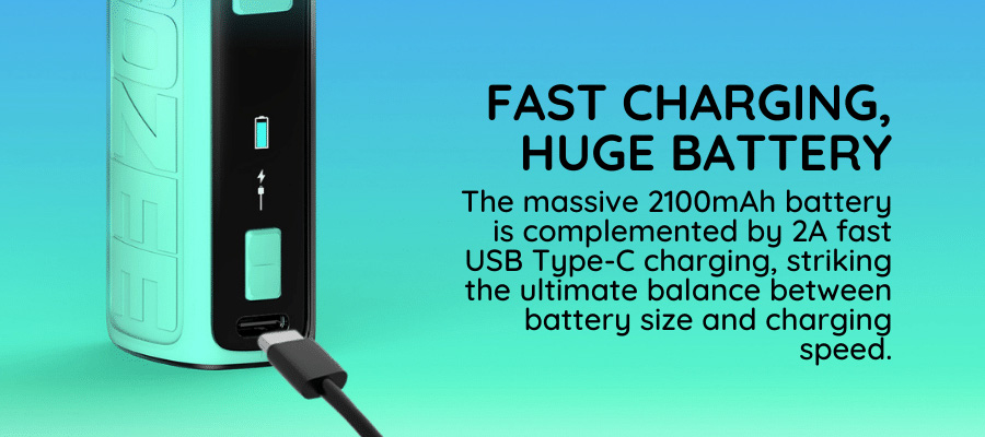 The massive 2100mAh internal battery will last most vapers at least 2 full days of regular use before requiring a recharge via the USB Type-C port located beneath the menu screen on the front of the device (a cable is included with the kit). The GOZEE is equipped with lightning fast 2A charging, striking the perfect balance between charging speed and battery longevity.