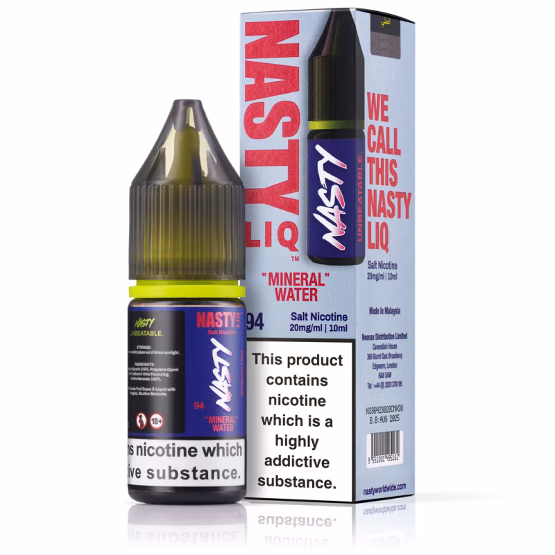 Experience the pure, revitalising taste of Mineral Water Nic Salt E-Liquid by Nasty Liq. This unique 10ml e-liquid delivers a crisp and clean sensation with a subtle icy finish, perfect for vapers seeking a refreshing, semi-sweet alternative to traditional fruit blends. Formulated with premium nicotine salts, it provides a smooth throat hit and rapid nicotine delivery.