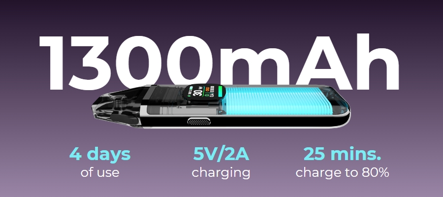 The OXVA Xlim Pro 2 houses a built-in 1300mAh battery—30% larger than its predecessor—and utilises USB type-C fast charging to reach 80% battery from 0% in just 25 minutes. A charging cable is included with the kit.