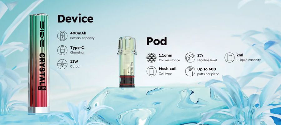 The SKE Crystal Plus Airflow Edition kit uses SKE Crystal Plus pods, which are sold separately in packs of 2. You can opt for the prefilled pods, which come with 2ml of 20mg (2%) strength nic salt E-Liquid and a pre-installed 1.1Ω mesh coil—meaning you only have to insert a pod to set up the vape.
