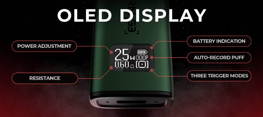 The user interface stands out with its crisp OLED screen, allowing for easy wattage adjustments. There’s an E-Liquid sight window so you can keep an eye on your juice levels, too.