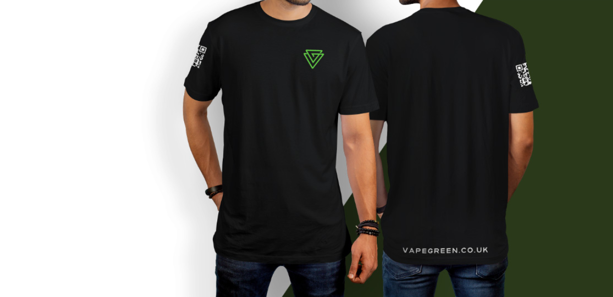 Our new Vape Green 2021 T-shirt comes in black with a stylish Green VapeGreen VG Logo at the top left chest and a URL barcode on the right arm sleeve. There is also a vapegreen URL on the back, a must have for any VapeGreen fans :)