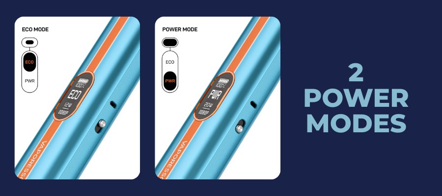 Thanks to Vaporesso’s AXON chipset, users can switch easily between ECO mode (14W) for extended battery life and PWR mode (24W) for richer clouds, using a convenient side slider for fast toggling.