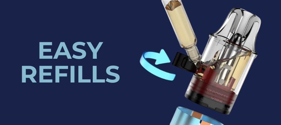 The pod features a clear, transparent body for monitoring e-liquid levels and a side-fill system for clean, hassle-free refills.