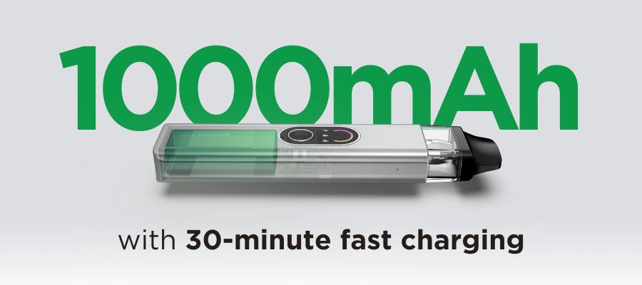 This pod kit is powered by an internal 1000mAh battery, which can be fully charged in 30 minutes via the Type-C USB cable included with the kit.