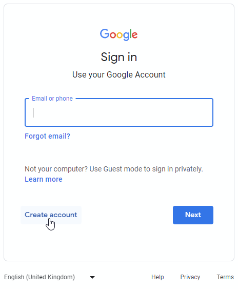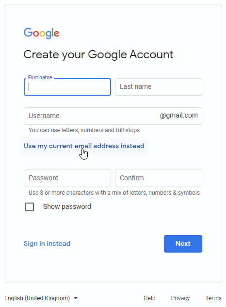 Click this option, then enter your details and create a password for your new Google account.